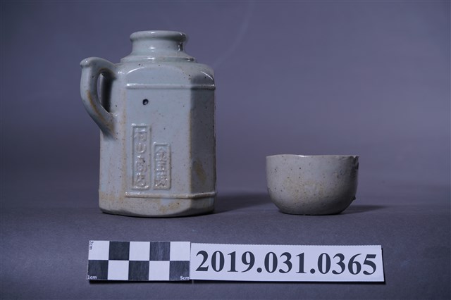 1.本物件是村山商店茶具。陶製品。淡綠色。主體為四角型,圓蓋子,瓶身印有「御茶」二字。以及說明使用完的空瓶請放在椅子下。下方有金五錢、村山商店字樣。 2.村山商店經營者為村山ミト,沖繩縣人,是琉球物產商。