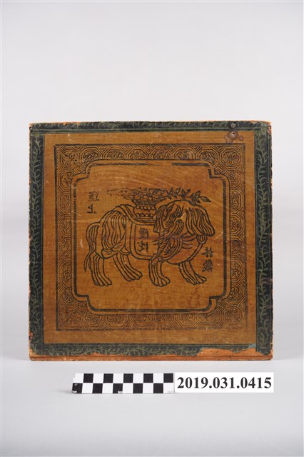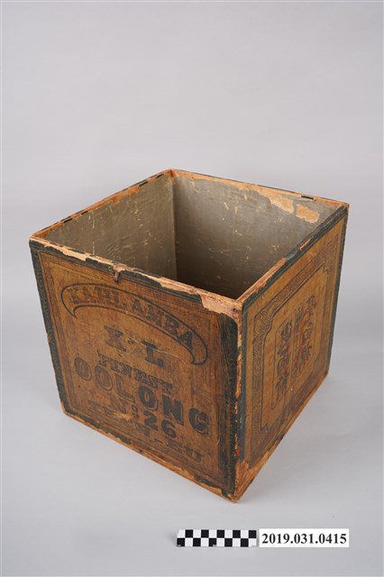 1.本物件為KAHLAMBA帆船運送烏龍茶葉的茶箱,材質為木頭。正面塗幾何圖形邊框,邊框內上面以黑字橫寫「KAHLAMBA」,為船舶名稱;「KAHLAMBA」下方橫寫「XL」;「XL」下方由上而下依序橫寫「FINEST」「OOLONG」(按:嚴選烏龍茶)、「No.26」、「TEEN_EU」(按:天遊位於武夷山地區)。一邊側面亦塗幾何圖形邊框,邊框內再畫方框,方框內書寫3行中文反體字,中間行直寫「種盡在名山九曲」,為福建武夷山的風貌;左側直寫「選雨前」;右側直寫「白毫旗」。另一邊側面同樣塗幾何圖形邊框,邊框內繪製神獸圖案。 2.茶箱是用來儲存、運送茶葉的箱子。19世紀至20世紀初期茶箱外面是以木板製成,內部再以鉛板防潮。茶箱外會繪製產品製造、輸送資料及圖案。 3.本物件上書寫之「KAHLAMBA」為船舶名稱。該船舶為鐵製三桅帆船,1856年於英國利物浦港登記,噸位319噸。下水後即派遣到亞洲,主要擔任福州、上海至澳洲的運輸任務。