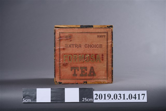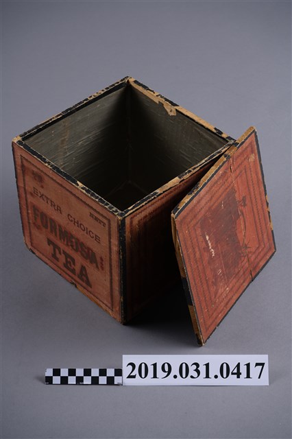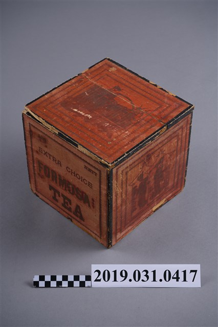 1.本物件為木茶箱。木製正方形。正面寫著「FORMOSA TEA」(臺灣茶),上方寫著EXTRA CHOICE。