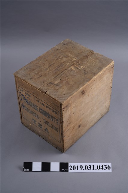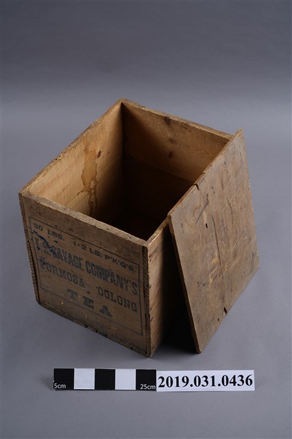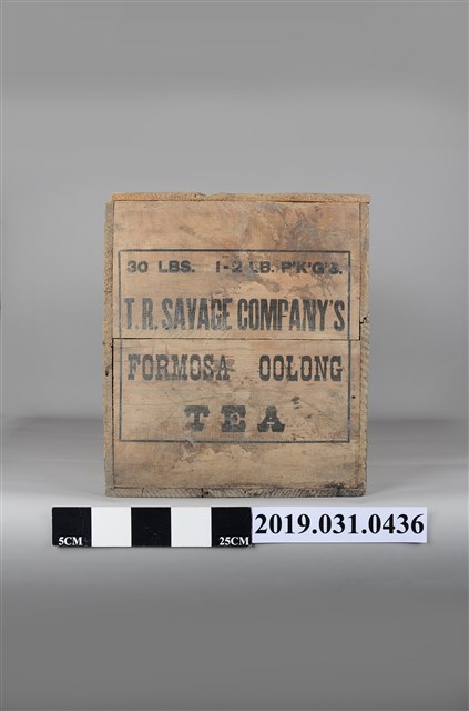 1.本物件為T. R. SAVAGE公司的臺灣烏龍茶木茶箱。木箱蓋為對開式。木箱內容標示設計黑線方框。方框上端橫書黑色「30 LBS. 1-2 LB. P.K.G.S.」(按:30磅重,每包重1-2磅)字樣;其下橫書「T. R. SAVAGE COMPANY’S」、「FORMOSA OOLONG」、「TEA」等3排字(按:T. R. SAVAGE公司臺灣烏龍茶)。 2.T. R. SAVAGE公司為19世紀前半葉創立於美國緬因州班戈鎮(Bangor)的公司,主要從事包括茶葉在內的乾貨買賣,臺灣烏龍茶買賣為其營業項目之一。該公司存續到1955年。