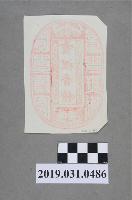 本物件為紅色橢圓戳章。中央設計咖啡色直長方框,框內直刻「雪裡香種」字樣。方框右側有陰刻之篆體「貨真價實」字樣;左側為陰刻之篆體「童叟無欺」字樣。