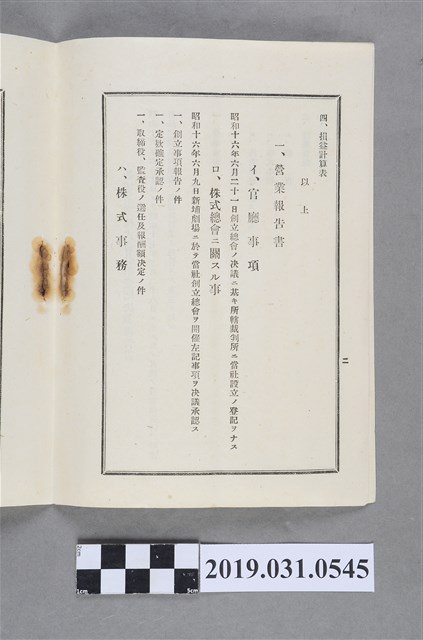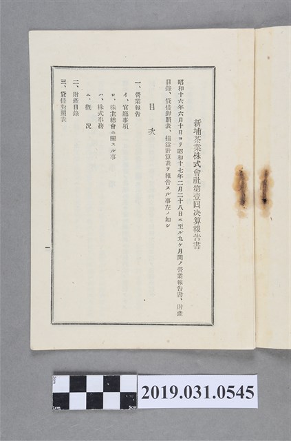1.本物件為新埔茶業株式會社編的股東大會決算《第壹回報告書》,書本為平裝。封面中央直印書名;右上角直印日期;左下角直印「新埔茶業株式會社」字樣。內容分為營業報告、財產目錄、貸借對照表、損益計算表等4個部分。無版權頁。 2.新埔茶業株式會社係於1941年6月9日在新埔劇場創立,由陳文達擔任社長。陳文達出生於1902年,臺北工業學校肄業。曾任新埔信用組合理事、監事;新埔庄協議會員;台新物產組合長等職,是日治時期新竹新埔地區重要的財經人物。