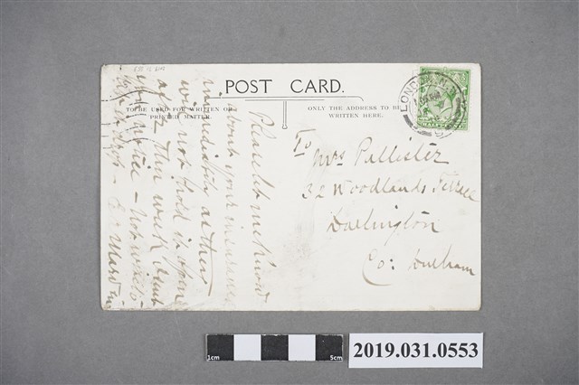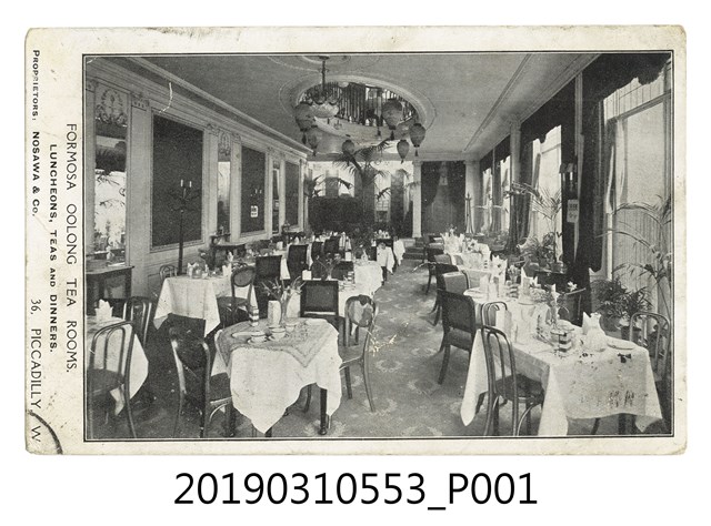 1.本物件是大典紀念京都博覽會場內福爾摩沙烏龍茶房明信片。紙製品。一張圖案是烏龍茶房,背後空白無書寫。 2.為紀念1915年大正天皇即位大禮,日本特別舉辦大典紀念京都博覽會。會期自10月1日至11月19日,共80天。設有3個會場,第一、第二會場位於京都動物園和平安神宮旁邊,第三會場位於帝國博物館內。其中,臺灣館設在第一會場,設置臺灣喫茶店,並有販售大稻埕寶香齋特產。另第一會場參考館內亦有展示阿里山樟木。