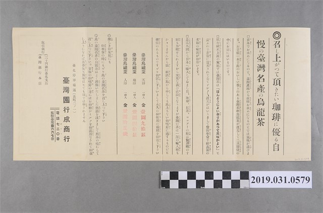 2019.031.0579 臺灣園行成商行臺灣名產烏龍茶說明書
