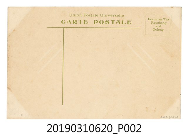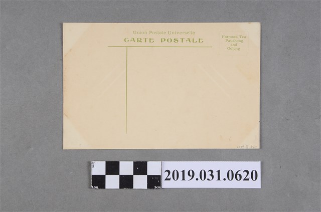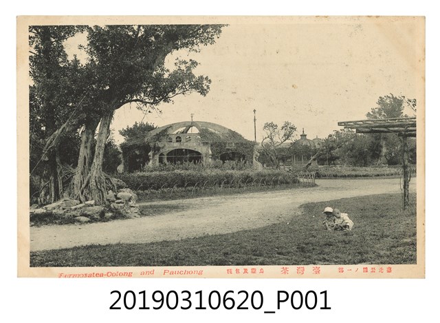 1.本物件為臺灣茶相關風景明信片。明信片場景在臺北公園,左下部有兩名孩童在草地上遊戲;左方建築為俱樂部;中央遠處亭閣式涼亭建築,為第一代音樂臺;照片右下端由右而左橫書「臺北公園ノ一部 臺灣茶 烏龍及包種」紅字;左下端為「烏龍及包種」的英文。