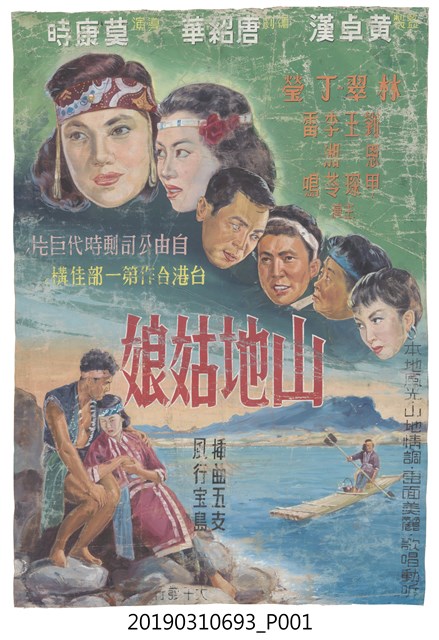 1. 陳子福手繪香港電影《山地姑娘》直式宣傳海報,海報分為上下兩塊,上半部海報上將主演頭像由大至小呈斜線排列,並以綠色塊為底;下半部則繪有一對身穿原住民服的男女坐在海邊石頭上,互相依偎的場景。海報上邊標有監製、編劇、導演名,以及主演名。海報上標有「本地風光、山地情調、畫面美麗、歌唱動聽」、「自由公司劃時代巨片」、「台港合作第一部佳作構」、「插曲五支 風行寶島」等宣傳字樣。2. 《山地姑娘》後改名為《日月潭之戀》,於1956年由香港自由影業出品,莫康時導演,艾安、沙麗文主演。1955年,自由影業公司來臺拍攝《山地姑娘》外景,棚內則跟中製廠租用攝影棚拍攝。當時農教(中影前身)攝影師莊國鈞因胃疾開刀無法工作,推薦《皆大歡喜》(1952)的攝影助理賴成英掌鏡。