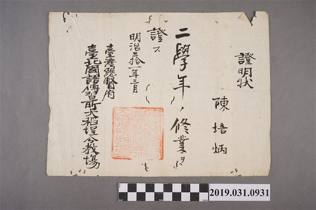 2019.031.0931 明治31年陳培炳國語傳習所修業證明狀