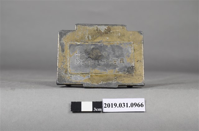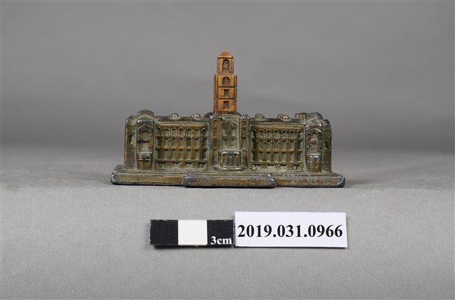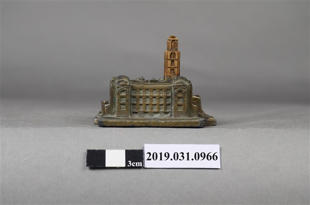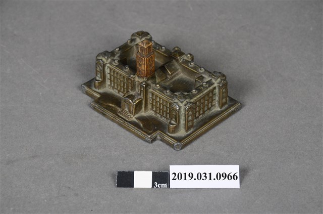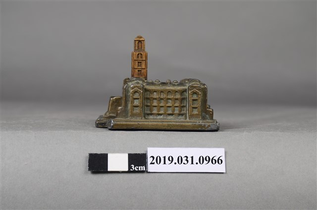 1.本物件為始政四十周年臺灣博覽會建築物造型紀念品。材質為金屬製,古銅色,是縮小版的石鹼販賣株式會社建築模型。