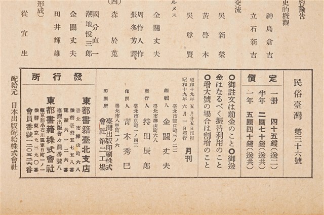 東部書籍臺北支店發行《民俗臺灣》月刊 通卷第三十六號