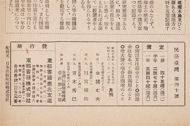 東部書籍臺北支店發行《民俗臺灣》月刊通卷第四十號