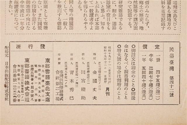 東部書籍臺北支店發行《民俗臺灣》月刊通卷第四十二號