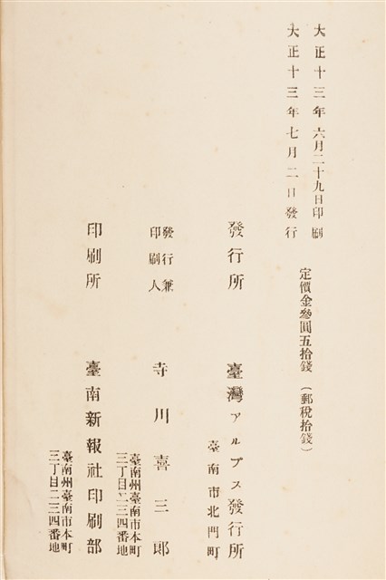 中曾根武多、豐守貢、臺灣阿爾卑斯、臺南新報社印刷部