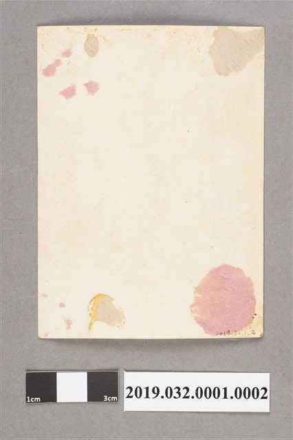 此文物為陳吳秀梅女士年輕時的全身照,年代不詳。髮型為耳下短髮,身穿條紋連身洋裝,腰間綁著緞帶,頸間圍上絲巾,手中拿著一個包包。背景有著海浪與椰子樹,地點不詳。此照片有些許的泛黃、破損,而左下角浮印南投二字。