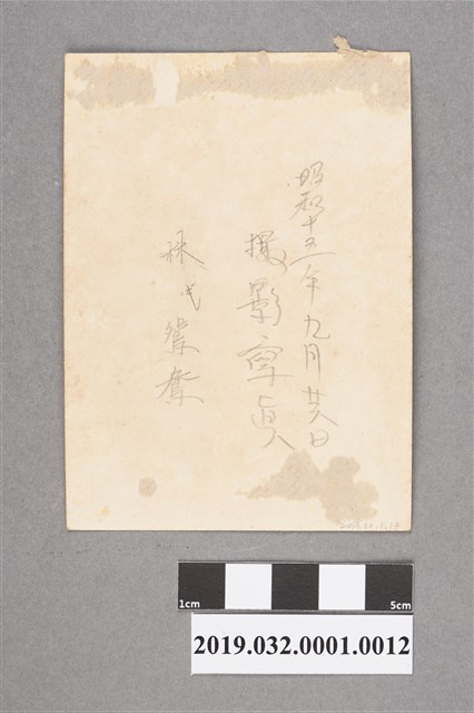 此文物為陳吳秀梅女士與另外一位女士的合照。坐在椅子上的是陳吳秀梅女士,髮型為耳下短捲髮,身穿一件圓領上衣,胸口有鈕扣做裝飾。