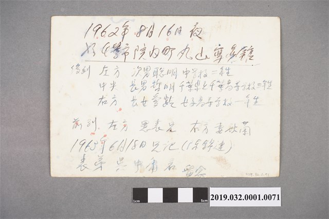 此為陳錦連在日本的全家福合照,黑白合照。前排為陳氏夫婦;後排為其二子一女,三人身穿學生制服。