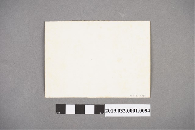 此文物為照片,為黑白照片,為陳吳秀梅女士與其家人之合照,有其丈夫與2子,陳吳女士為左1,拍攝地點不詳,但有小型拱橋設計於水池上,陳吳女士身穿黑色外衣與黑7分褲,左手披著外套。