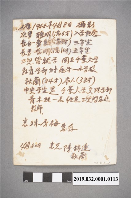 此為陳錦連家庭照,六人黑白合照。畫面中的後方有身著西裝的站立男子與前方呈坐姿的婦女,他們之間尚有三位孩童與一位身高相對突出的男子。
