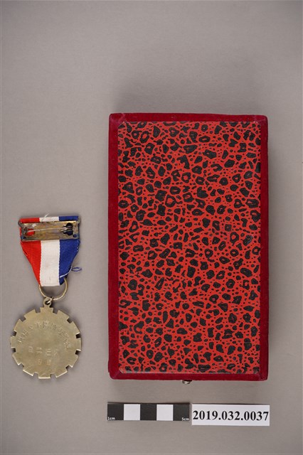 此為陳吳秀梅於台灣金屬礦業公司附屬醫院連續工作25年獲得的銀質久任獎章及裝有獎章的錦盒,勳帶顏色由左至右依序為藍、白、紅,勳帶背面附有別針,錦盒外殼正面酒紅色絨布鑲有金色「經濟部所屬事業機構久任獎章」字樣。