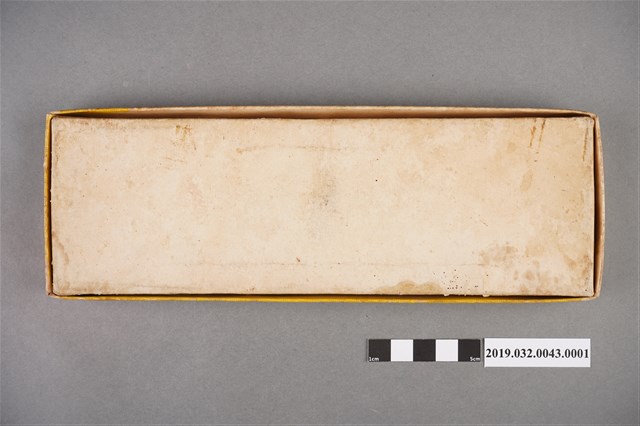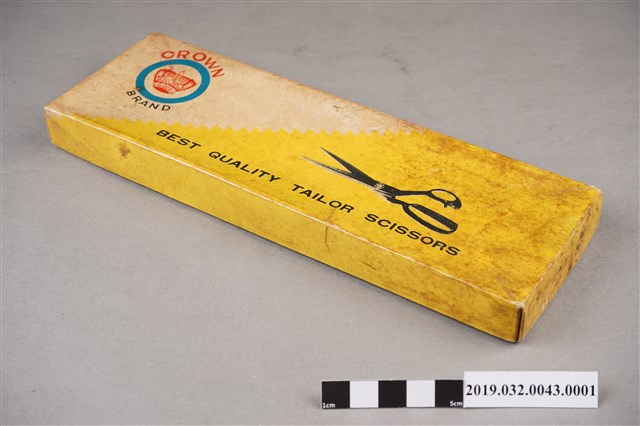 此為裁縫用剪刀外包裝紙盒,正面左上角應為製造牌子CROWN BRAND,下方寫有裁縫剪刀的英文TAILOR SCISSORS,為上蓋式,還有產品圖樣襯上黃色背景。側面寫有該裁縫剪刀尺寸為9,單位不明。