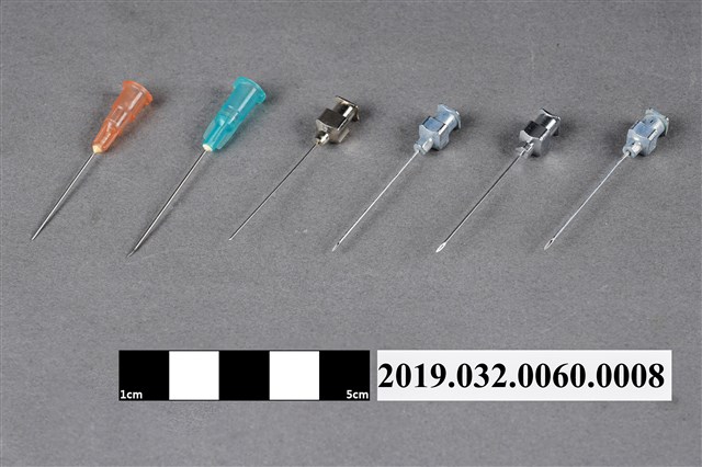 此為針頭,共有六個,其中有4個長的一樣,都是成圓柱狀後接方柱狀再接圓柱狀,下方則為長長的針狀(一個上頭刻有22的字樣,一個刻有23的字樣),另外兩個為套有塑膠外殼的針頭,一為粉紅色,一為淺藍色。