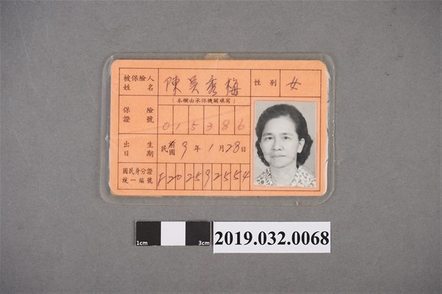本文物為一張陳吳秀梅女士的中華民國退休公務人員疾病保險的保險證,證面下方貼有藍色標籤,背面寫有保險證號、國民身分證統一編號、出生日期、姓名和性別並貼有一張大頭照。