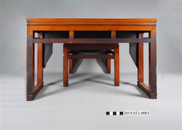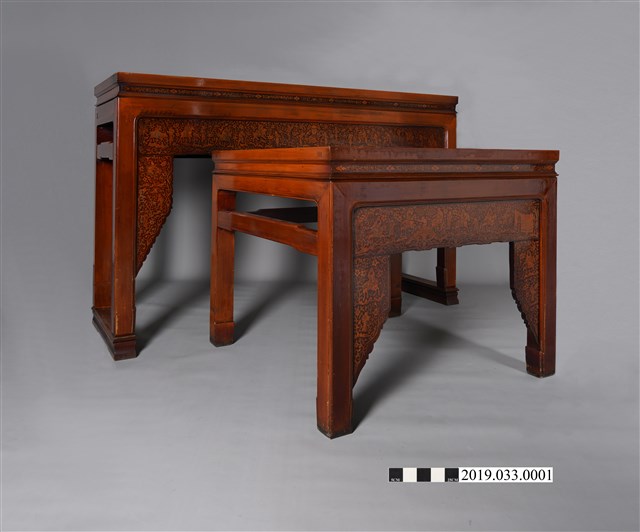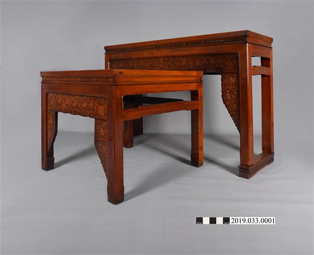 本組供桌分為頂下桌,為民間祠堂常見形制,上桌多擺設祖先龕與禮器,下桌多為供品所用,本組文物外觀以線條表現為主,風格偏屬漳福,表面髹有清漆,無多餘雕刻裝飾,束腰、花楣與插角有平崁的茄苳入石柳傳統技法,頂桌刻有三十六官將,下桌刻有竹林七賢的七賢過關,除少數使用痕跡與漆膜脫落外,其餘結構完整且穩固。
