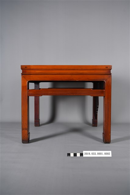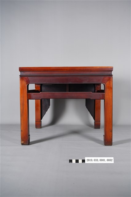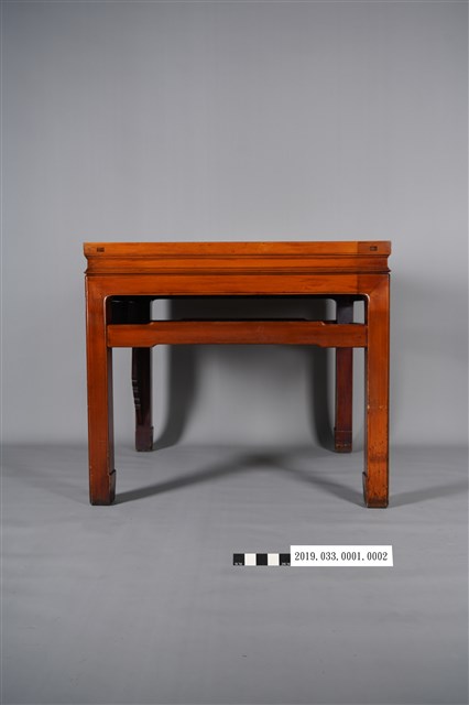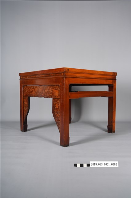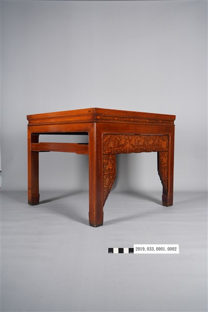 本組供桌分為頂下桌,為民間祠堂常見形制,上桌多擺設祖先龕與禮器,下桌多為供品所用,本組文物外觀以線條表現為主,風格偏屬漳福,表面髹有清漆,無多餘雕刻裝飾,束腰、花楣與插角有平崁的茄苳入石柳傳統技法,頂桌刻有三十六官將,下桌刻有竹林七賢的七賢過關,除少數使用痕跡與漆膜脫落外,其餘結構完整且穩固。