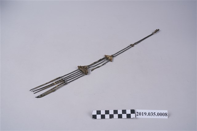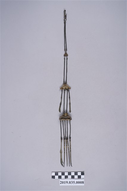 本件推測為一副隨身萬用工具組,鍊條彼此互組,結構上可以分為4層。第1層最頂端為勾合處,底下接連兩個鍊條;第2層以一小型磬形物,底下再接連兩個鏈條;第3層以一中型磬形物,連接2支小型刀具,以及兩個鍊條;第4層則為一中型磬形物(似有隱含蝙蝠圖樣),底下接連5個鍊條,每個鍊條都各串有一支小型刀具或鑿子,共有5支。