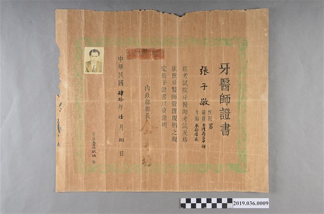 2019.036.0009 民國40年張子敬中華民國牙醫師證書