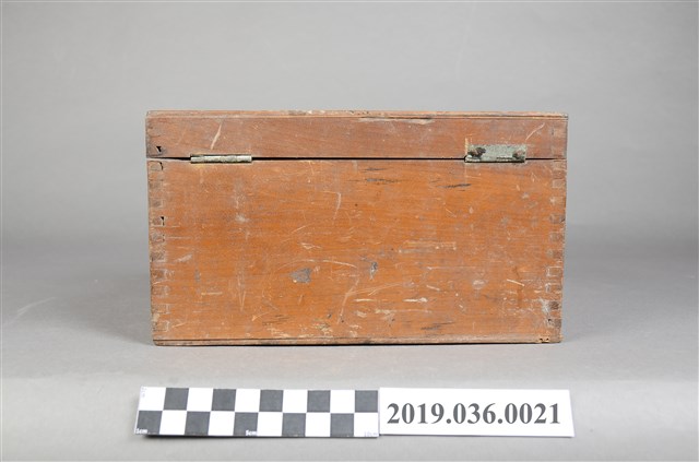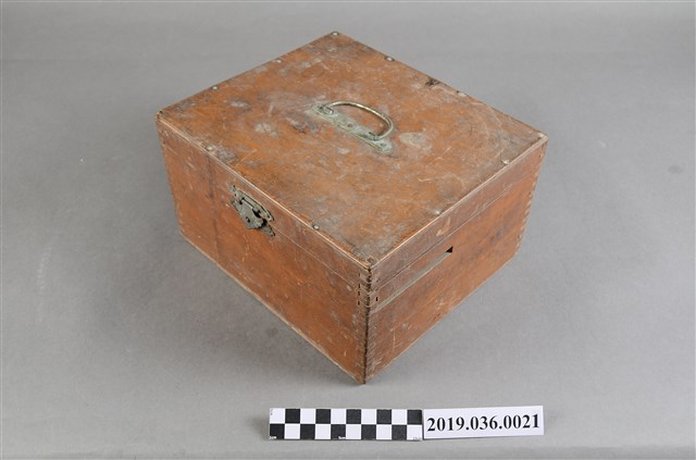 張子敬戰後於高雄市自行開立診所時所使用的物品,深褐色正方形小木箱,箱蓋為上開式,上方附有銅製提把,前側附一銅蓋鎖,蓋子內側有3條紅色的橡皮條,可綁縛物品,木板上以鉛筆寫「張子敬」、「928P31下38 Ijhul」等字。木箱箱體側邊木板以榫接結合,側邊有一長條形溝槽,用途不明(筆者推測可能為錢箱?)。箱內裝有3個鐵線圈,用途不明。
