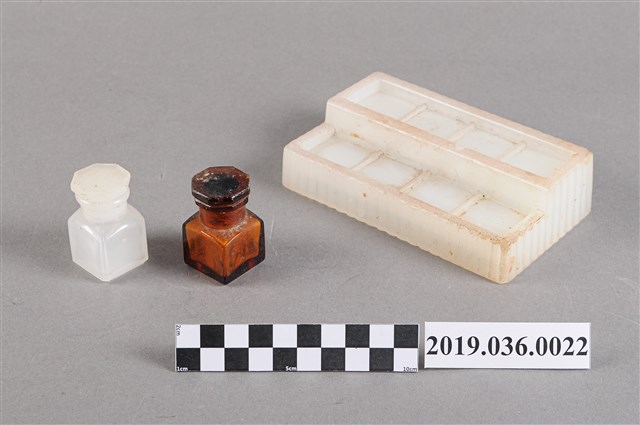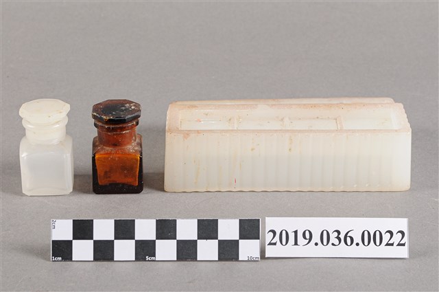 張子敬戰後於高雄市自行開立診所時所使用之藥罐組,共1組3件,包括1個白色玻璃製雙層藥罐底座,2個小藥瓶,分別為褐色與白色罐。據捐贈者表示為牙科治療用藥。