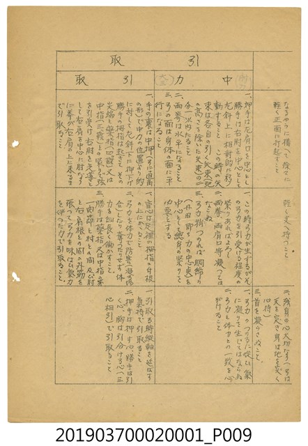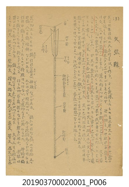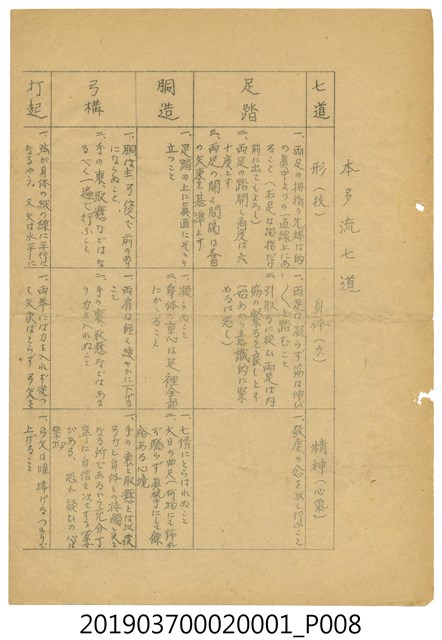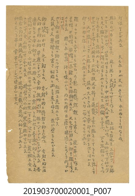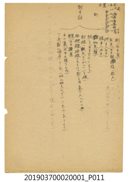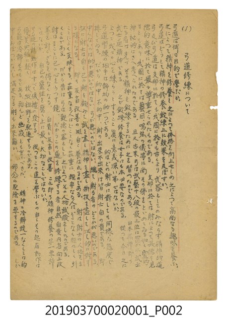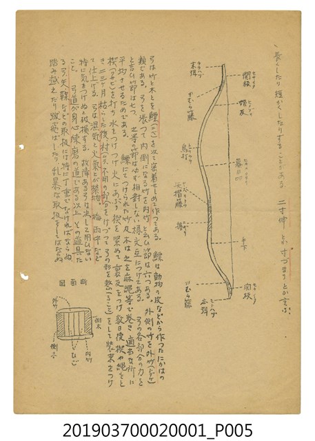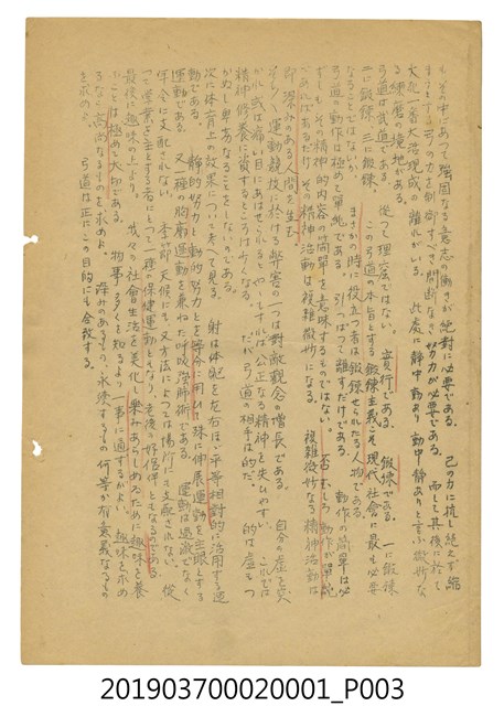 本文件為黃金梭就讀就讀臺北州立臺北第三高等女學校時期,參加弓道社團所留下來的筆記記錄,內容包含弓道修練的目的、內容、弓與箭的結構說明、動作等關於弓道的知識。日治時期的學校體育教育範疇中,加入日本傳統武道運動,其中女學生多練習弓道與薙刀等項目。臺北州立臺北第三高等女學校,學校沿革如下:1897年,臺灣總督府國語學校第一附屬學校女子分教場;1902年,臺灣總督府國語學校第二附屬學校;1910年,臺灣總督府國語學校附屬女學校;1919年,臺灣公立臺北女子高等普通學校;1922年,臺北州立臺北第三高等女學校;1945年,臺灣省立臺北第二女子中學;1967年,臺北市立中山女子高級中學。
