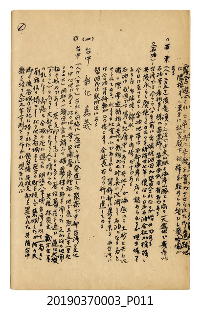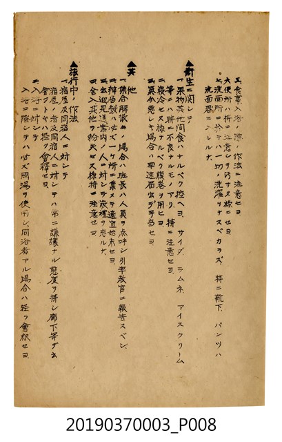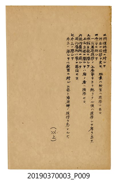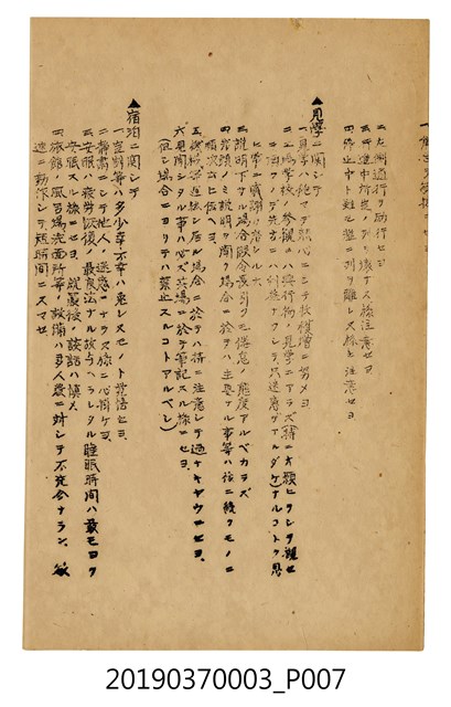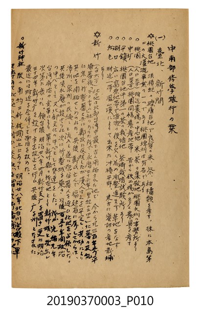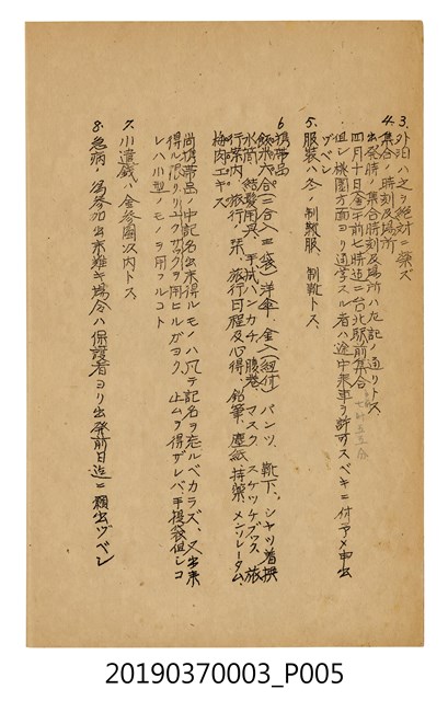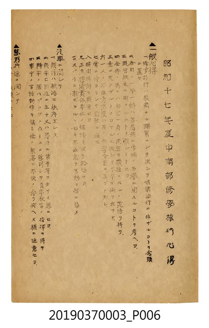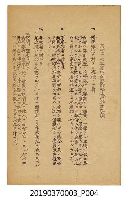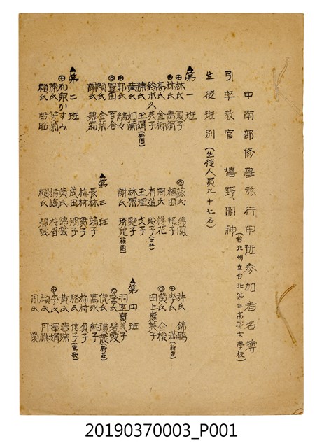 本件為黃金梭就讀臺北州立臺北第三高等女學校時期,推測為三年級時,於1942(昭和17)年學校修學旅行手冊,內容包含參與學生名冊;參加要點,包含修學旅行的教育方針、參加或部參加者的安排、外宿須知、服裝與攜帶物品須知等相關資訊;修學旅行心得,包含學習、交通、住宿等注意要點;以及行程之中各地點說明介紹。本次修學旅行領隊教官為嬉野明神,名冊上共有10班97名女生。本修學旅行以中南部地點為主,於4月10日至13日共4日的行程,由臺北出發,一路依序前往彰化、臺中、嘉義、臺南,最後回到臺北。臺北州立臺北第三高等女學校,學校沿革如下:1897年,臺灣總督府國語學校第一附屬學校女子分教場;1902年,臺灣總督府國語學校第二附屬學校;1910年,臺灣總督府國語學校附屬女學校;1919年,臺灣公立臺北女子高等普通學校;1922年,臺北州立臺北第三高等女學校;1945年,臺灣省立臺北第二女子中學;1967年,臺北市立中山女子高級中學。