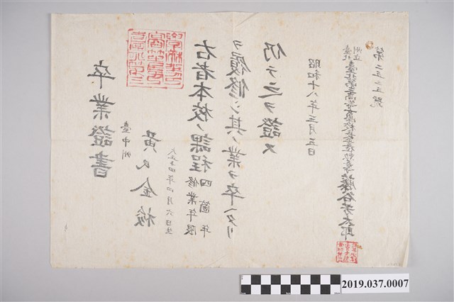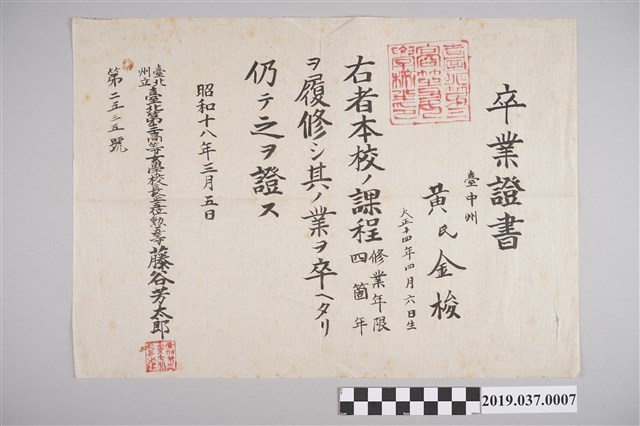 2019.037.0007 黃金梭臺北州立臺北第三高等女學校畢業證書