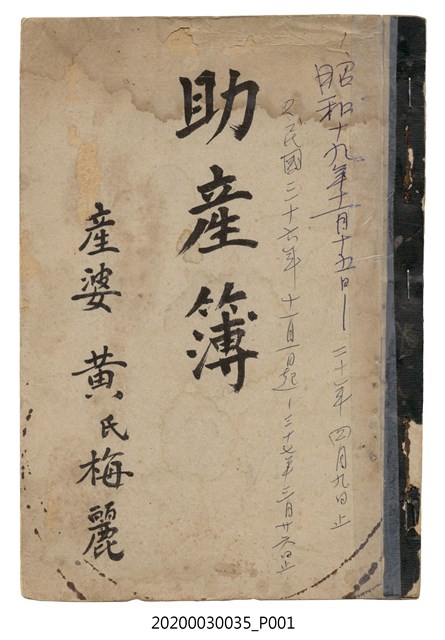 本文物為黃陳梅麗助產簿,時間從昭和19年(1944)12月15日至昭和21年(1946)4月9日;民國36年(1947)11月1日至民國37年(1948)3月26日。黃陳梅麗(1920-2019)助產士,1937年畢業於臺北市蓬萊產婆講習所,1941年申請新竹州產婆許可證,同年於新竹市開業,至1984年退休。助產簿內容記載黃陳梅麗協助生產的詳細資訊,包含姓名、地址、產婦分娩次數、經過概要及初生兒健康情形等。日治時期為嚴格管理戶口人數,助產簿須由地方警察署進行定期查驗,封面內頁不僅蓋有新竹警察署印記、日期章,尚須註明助產簿的紙張頁數,每頁均蓋有騎縫章,以及警察檢驗日期、檢驗負責人章;戰後對於助產紀錄並沒有嚴格的檢驗制度,但記錄內容為因應出生證明書的格式統一,對於父母及初生兒的基本資料記載更加詳備。陳梅麗捐贈之助產簿共計27冊,工作紀錄簿1冊,為臺灣日治至戰後生產照護體系、戶政制度變遷物質見證。