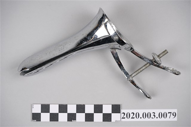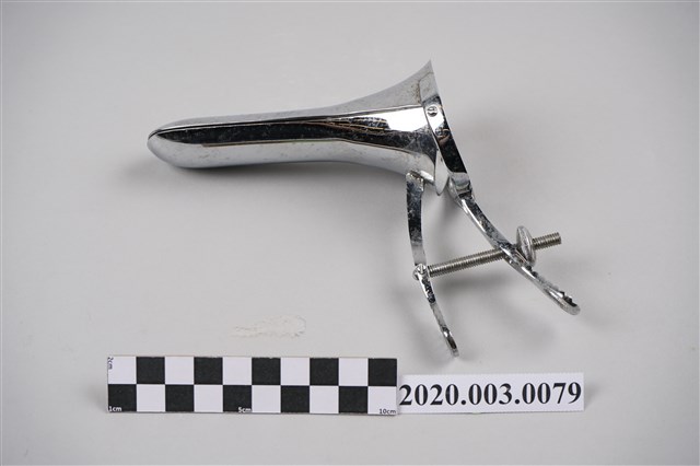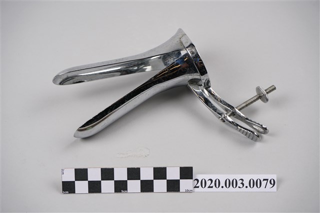 本文物為黃陳梅麗助產用鴨嘴鉗,金屬製,用於生產時放入孕婦陰道避免陰道及子宮頸過度收縮,影響生產。