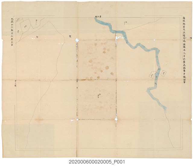 1.本物件為〈南投郡草屯庄雙冬地圖謄本〉三十六葉,一共有10本,分別是32、30、23、16、15、10、8、6、5、4號,每本封面皆寫上「草屯庄雙冬第三十六葉之內」字樣,封面皆為綠色書皮,內頁翻開後為白色紙張畫上地圖並著顏色,旁邊並寫有「南投郡草屯庄雙冬地圖謄本三十六頁之內第四號一筆」,另一邊則寫有時間為大正十二年十二月三日,所有物件雖有些許泛黃但保存尚可。2.草屯庄,為1920 -1938年間存在之行政區,轄屬臺中州南投郡,1943年升格為草屯街,戰後成為今南投縣草屯鎮,而雙冬地區大致包括雙冬里、平林里、土城里東部。