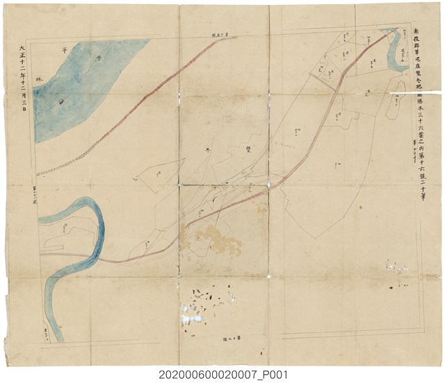 1.本物件為〈南投郡草屯庄雙冬地圖謄本〉三十六葉,一共有10本,分別是32、30、23、16、15、10、8、6、5、4號,每本封面皆寫上「草屯庄雙冬第三十六葉之內」字樣,封面皆為綠色書皮,內頁翻開後為白色紙張畫上地圖並著顏色,旁邊並寫有「南投郡草屯庄雙冬地圖謄本三十六頁之內第四號一筆」,另一邊則寫有時間為大正十二年十二月三日,所有物件雖有些許泛黃但保存尚可。2.草屯庄,為1920 -1938年間存在之行政區,轄屬臺中州南投郡,1945年升格為草屯街,戰後成為今南投縣草屯鎮,而雙冬地區大致包括雙冬里、平林里、土城里東部。