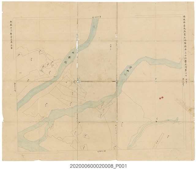 1.本物件為〈南投郡草屯庄雙冬地圖謄本〉三十六葉,一共有10本,分別是32、30、23、16、15、10、8、6、5、4號,每本封面皆寫上「草屯庄雙冬第三十六葉之內」字樣,封面皆為綠色書皮,內頁翻開後為白色紙張畫上地圖並著顏色,旁邊並寫有「南投郡草屯庄雙冬地圖謄本三十六頁之內第四號一筆」,另一邊則寫有時間為大正十二年十二月三日,所有物件雖有些許泛黃但保存尚可。2.草屯庄,為1920 -1938年間存在之行政區,轄屬臺中州南投郡,1946年升格為草屯街,戰後成為今南投縣草屯鎮,而雙冬地區大致包括雙冬里、平林里、土城里東部。
