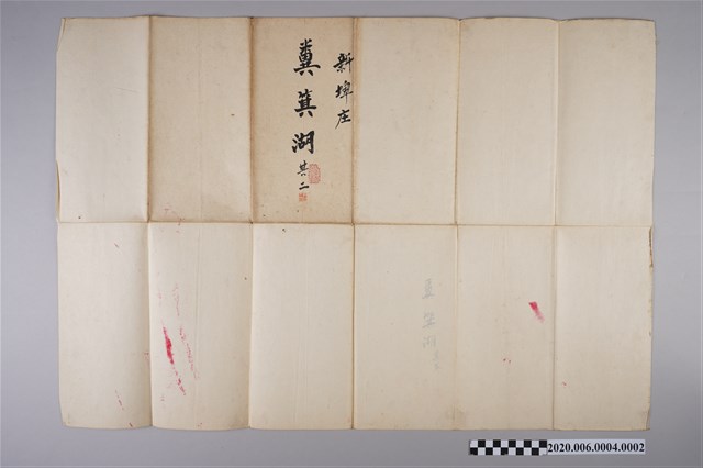 1.本物件為〈新埤庄地圖〉,一共有4本,分別為「新埤 全」、「南岸 全」、「糞萁湖 其一」、「糞萁湖 其二」,每本的外觀收納起來皆為長方形,打開則為該地區的圖形說明,其中一頁為「阿緱廳港東中里新埤頭庄」地圖,除了畫有地圖,並有文字說明,所有物件保存尚可,僅有些許泛黃。2.新埤庄,為1920年-1945年間存在的行政區,轄屬高雄州潮州郡,並立新埤庄役場為行政中心,今屏東縣新埤鄉,根據日治時代的1935年的國勢調查,新埤庄內有60%左右的客家人與27%的熟番,今日當地獅頭、餉潭兩社區普遍被認定為是馬卡道族的聚落,客家屬六堆中的左堆,其主要產業活動為一級產業。