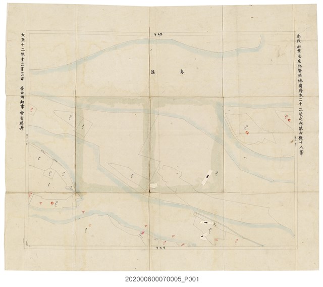 1.本物件為〈一千二百分之一北勢湳地圖〉謄本,一共有21本,每本封面皆寫上「北勢湳第 號」字樣,大多封面為白色書皮,內頁翻開後為白色紙張寫有「北勢湳地圖謄本 臺中州南投郡草屯庄 縮尺千二百分之一 總計九百七十三筆」,地圖謄本的另一邊則寫有時間為大正十二年十二月三日,及臺中州知事 常吉德寿,所有物件雖有些許泛黃但保存尚可。2.北勢湳,是臺灣南投縣草屯鎮的一個傳統地域名稱,位於該鎮中部北側,1920年,全臺地方制度大改正,廢十二廳改設五州二廳,該庄改制為「北勢湳」大字,隸屬於臺中州南投郡草屯庄。1938年,草屯庄升格為草屯街。