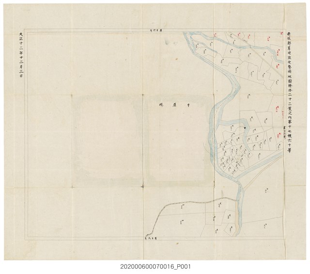 1.本物件為〈一千二百分之一北勢湳地圖〉謄本,一共有21本,每本封面皆寫上「北勢湳第 號」字樣,大多封面為白色書皮,內頁翻開後為白色紙張寫有「北勢湳地圖謄本 臺中州南投郡草屯庄 縮尺千二百分之一 總計九百七十三筆」,地圖謄本的另一邊則寫有時間為大正十二年十二月三日,及臺中州知事 常吉德寿,所有物件雖有些許泛黃但保存尚可。2.北勢湳,是臺灣南投縣草屯鎮的一個傳統地域名稱,位於該鎮中部北側,1920年,全臺地方制度大改正,廢十二廳改設五州二廳,該庄改制為「北勢湳」大字,隸屬於臺中州南投郡草屯庄。1938年,草屯庄升格為草屯街。