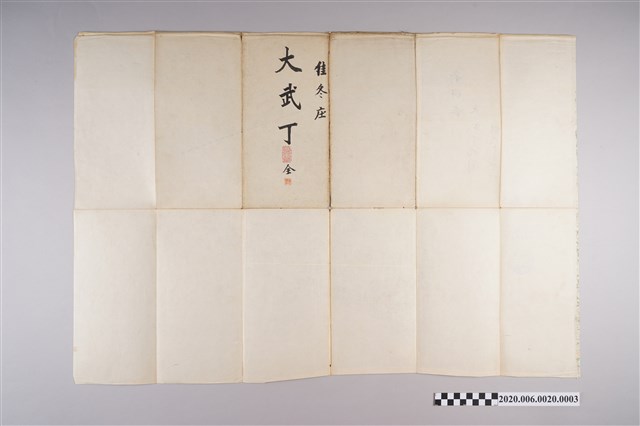 1.本物件為〈六千分之一佳冬庄地圖〉謄本,一共有7本,為「佳冬庄 武丁潭 全」、「佳冬庄 塭子 全」、「佳冬庄 大武丁 全」「佳冬庄 昌隆 全」、「佳冬庄 下埔頭並葫蘆尾 全」、「佳冬庄 石光見 全」、「佳冬庄 羗園 全」,其外觀收納起來為長方形,打開則為該地區的圖形說明,其中一頁寫有「武丁潭庄地圖 阿緱廳港東中里 1/6000」,除了畫有地圖,並有文字說明,所有物件保存尚可,僅有些許泛黃。