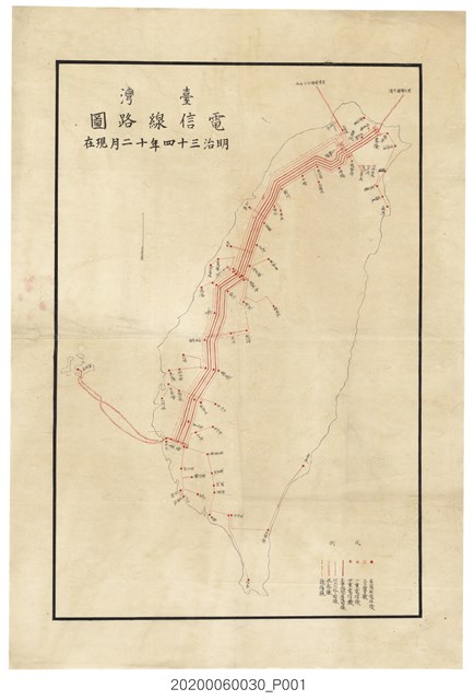 1.本件為〈明治三十四年臺灣電信線路圖〉,左上方寫著「臺灣 電信線路圖 明治三十四年」,中間為臺灣全島地圖,並以紅色線條匯出電信線路圖所在地,並連結至澎湖島,右下方有凡例,說明各記號代表之意義,包含莫爾斯電信機(今摩斯電信)、音響機、二重電信機、四重電信機、主要地間直通回線、水底線、預備線等。