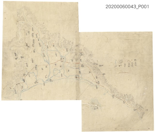 1.本件為〈臺灣宜蘭地區手繪地圖〉,以手寫線條,畫出宜蘭之山川和河流。地圖雖年代久遠,但仍可隱約看出該地之重要地名,例如:土圍、礁溪等,右邊則繪有凡例的代表圖案,包含出張所、派出所、道路、村道、山、河等內容。