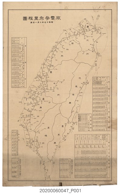 1.本物件為〈昭和十七年臺灣旅費參考里程圖〉,為長方形圖紙,紙上主要畫有臺灣圖形,並劃出臺北州、新竹州、臺中州、臺南州、高雄州、花蓮港廳與臺東廳範圍,旁邊則寫有移轉料、通行稅、特別旅費、臺灣旅費與內地旅費等相關資料,最上方並寫有旅費參考里程圖與時間昭和十七年十月一日,整個物件有明顯斑駁泛黃與些許摺痕。2.因臺灣身為新領有殖民地的特殊性,相關制度亦在臺灣總督府的統治需求下. 進行若干的調整,為了掌握各地的位置以及交通往返時間,因此印製有臺灣旅費參考里程圖,附上簡圖與各地旅費之計算方式以及給付準則,其中還包含通行稅以及島內島外的旅費計算方式,也可以作為了解臺灣早期橫貫道路的系統性了解。