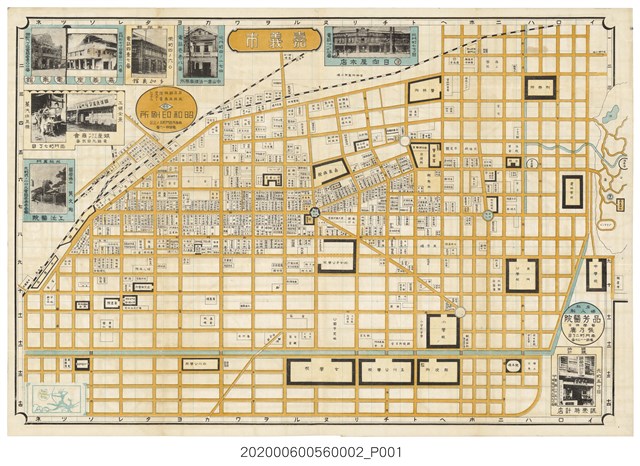 1.本物件為東京圖版社出版〈嘉義市最新圖〉,方形紙張上畫有街道標示及店家名稱,地形方正規矩並以黃色標示為道路,其中並標有嘉義病院、女子公學校等地點,地圖右下及左上分別有2張及7張黑白照片及印戳,其主題為街市商店資訊,地圖背面最上面印有紅色字體「臺灣 臺南州」及紅色字體寫有「嘉義市最新圖」最下方則有「東京圖版社」字樣,整個物件有明顯斑駁及毀損處。2.1895年馬關條約將臺灣割讓給日本之後,嘉義縣改為嘉義支廳,由臺南縣管轄,1900年,日人再將臺灣行政區劃調整為臺北、臺中、臺南三縣及宜蘭、臺東、澎湖三廳,嘉義地區全境被劃入臺南縣,下轄嘉義、打貓、樸仔腳三個辨務署,職業細圖主要目的在登錄當時之店家,並盡可能的將店名完整收錄於圖面上,因此僅能提供商家相關位置資訊而非絕對之地理空間位址,明細圖上之街道尺寸、角度、位置並非真實都市空間,經過調整後呈現出城市原始樣貌。