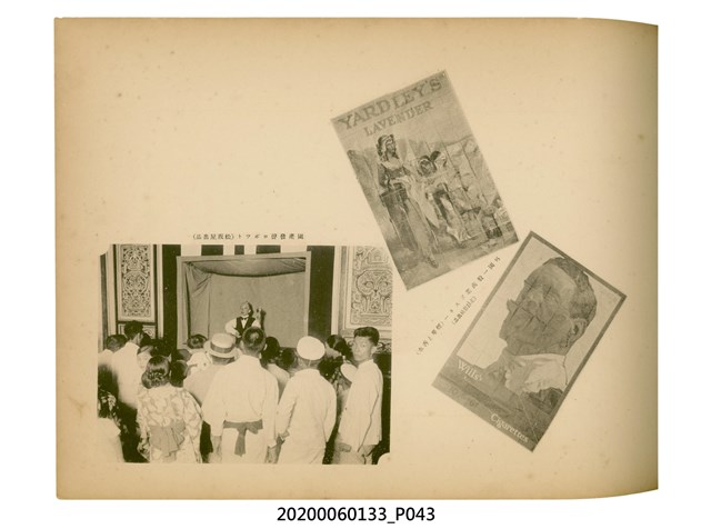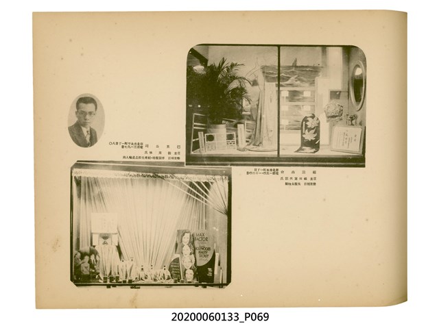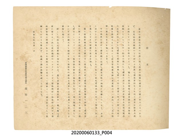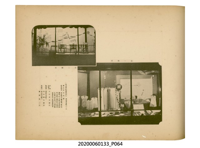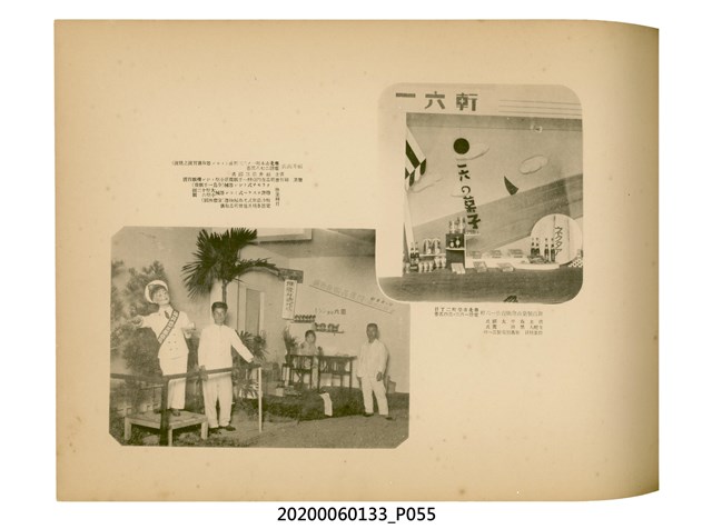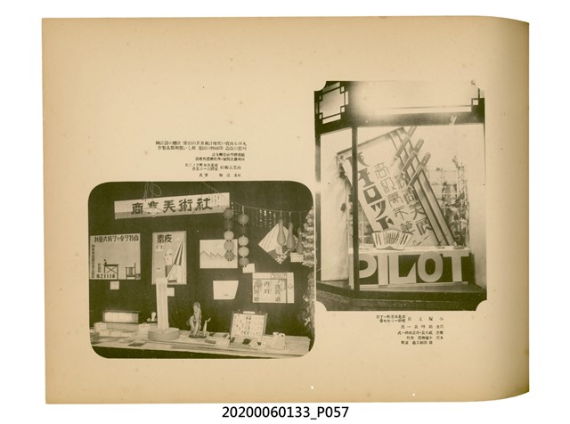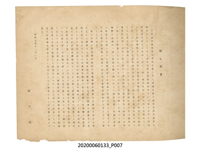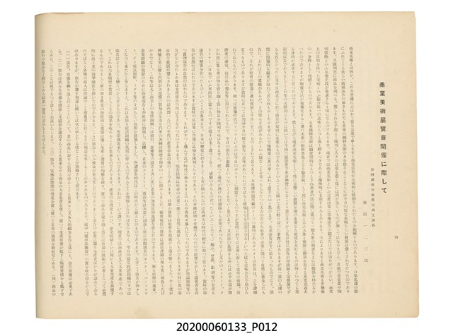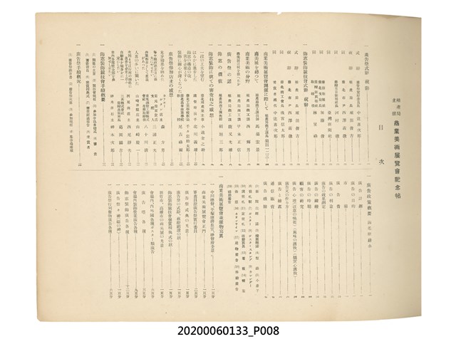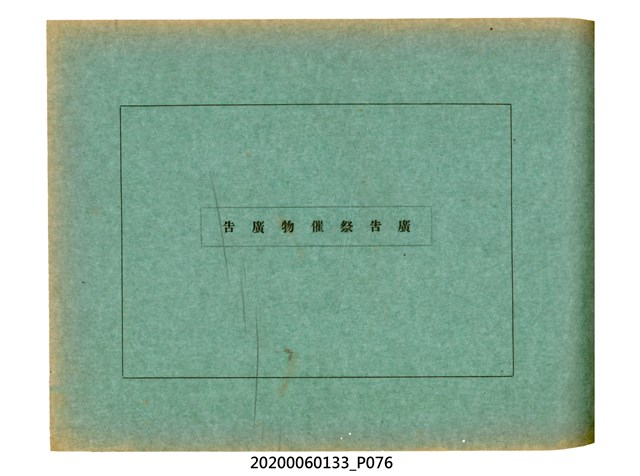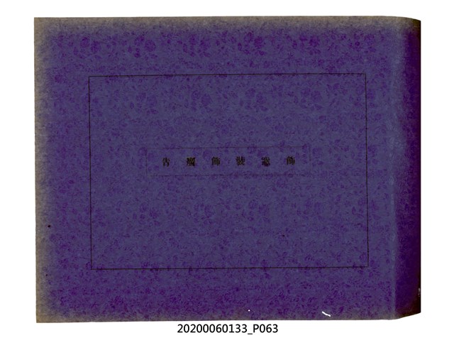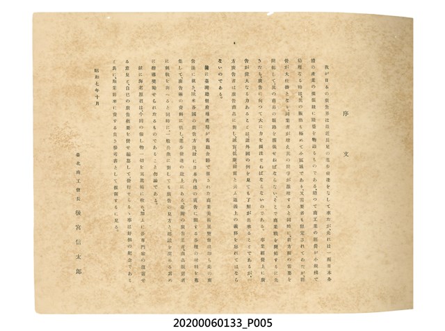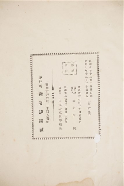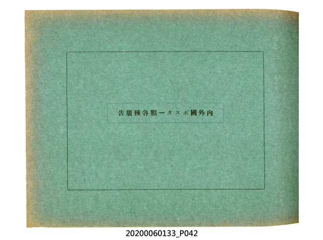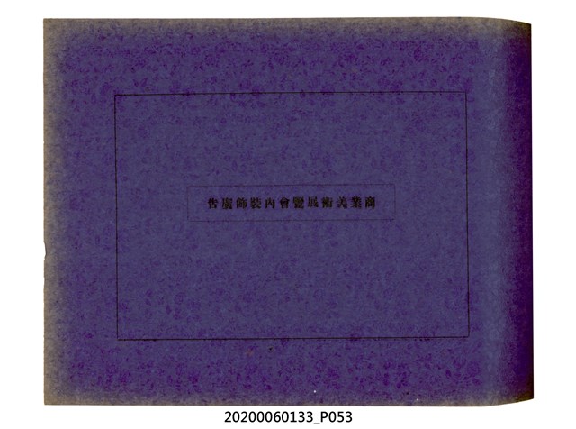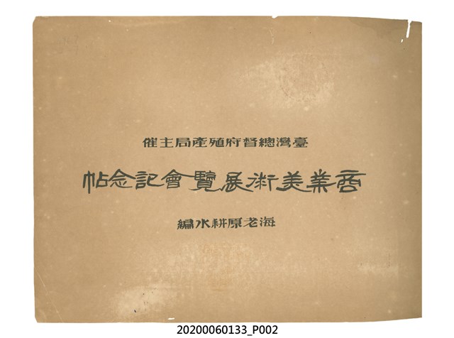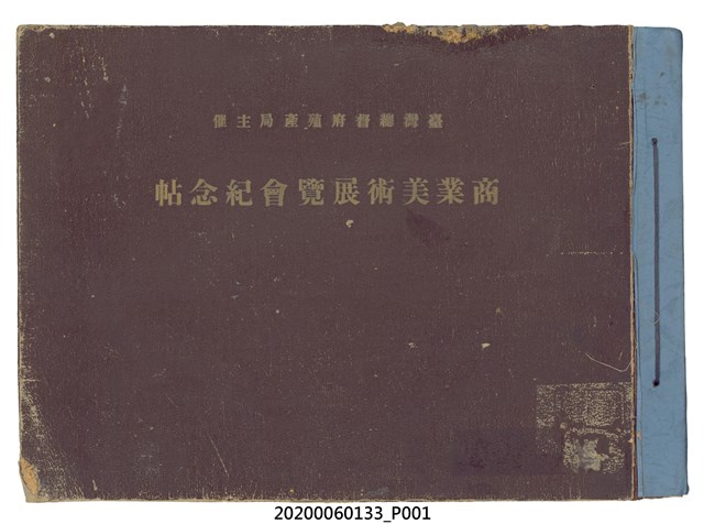 1.本物件為產業評論社發行之《臺灣總督府殖產局主催商業美術展覽會紀念帖》。封面、封底以深紅色為底色,精裝線裝。封面上半部由右而左橫印「臺灣總督府殖產局主催」、「商業美術展覽會紀念帖」兩排字,「主催」是日文主辦之意。內頁首頁續印兩排書名,並在書名下橫印「海老原耕水編」字樣。內文前有緒言、目次。內容分為兩大部分,前半部為文字,收錄殖產局長、臺北市尹以降,各官民之祝辭,以參與者感言、參展程序、廣告政策概要等,共數十篇文章。後半部為總督、總務長官及展覽會寫真照片。文末附有版權頁,上載著作、印刷、發行等相關資訊。 2.為指導及獎勵臺灣全島事業經營者使用商業廣告,促進臺灣產業開發及工商業進展,1932年7月20至24日間,臺灣總督府殖產局結合商業團體,舉辦商業美術展覽會,由殖產局長殖田俊吉任會長,會場設在總督府舊廳舍,即今植物園內的欽差行臺。展覽會的展示內容,包括一般商業廣告、櫥窗與櫥窗照片、戶外看板與立體電力廣告、廣告相關參考資料與統計資料等。展覽會舉行期間,並舉辦廣告祭及窗飾裝飾競技會等活動。
