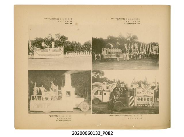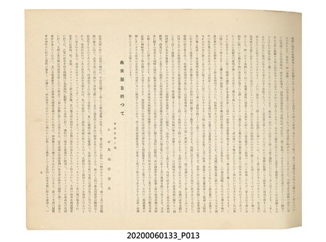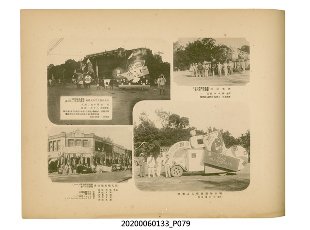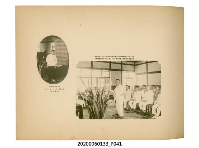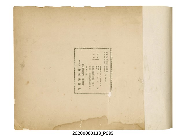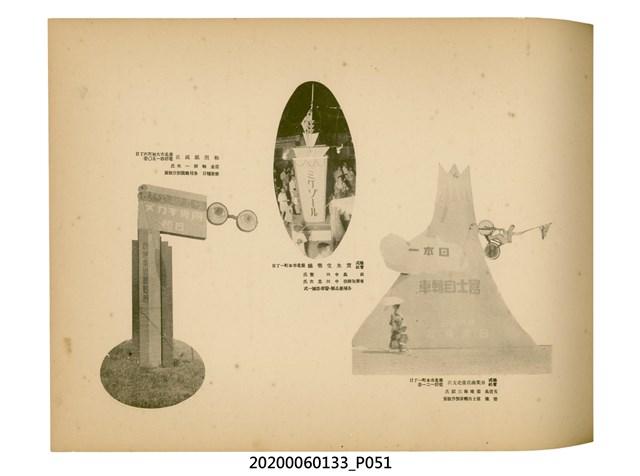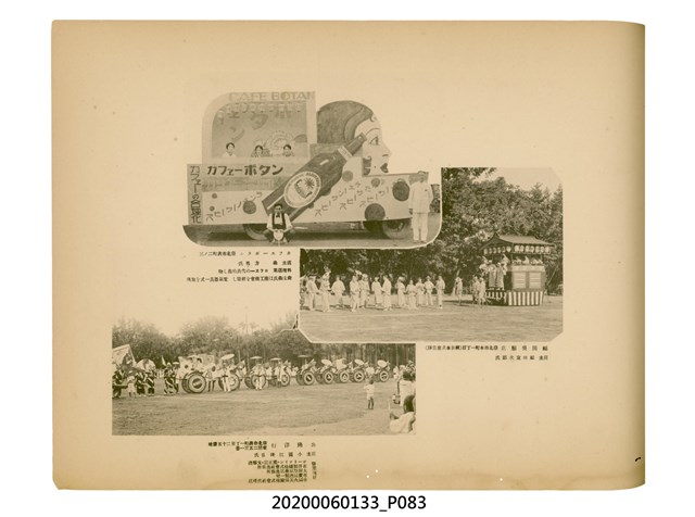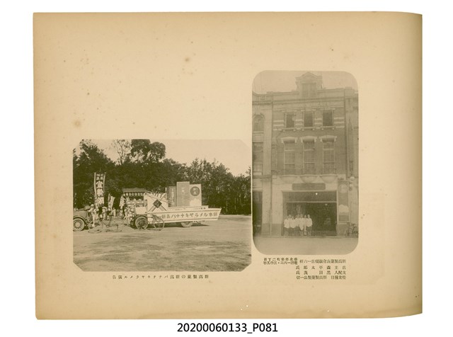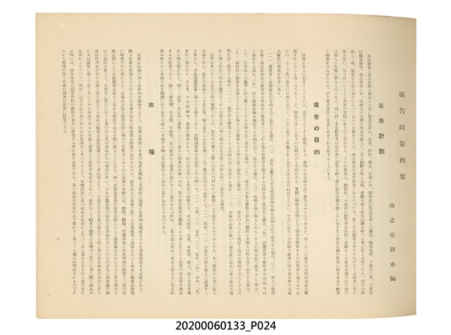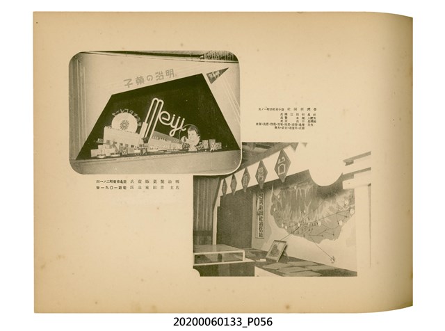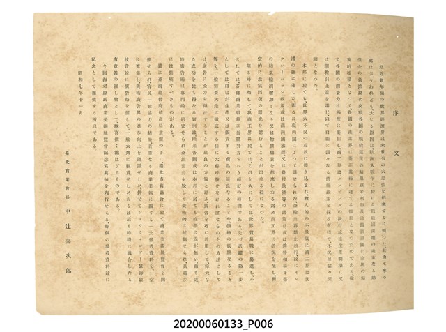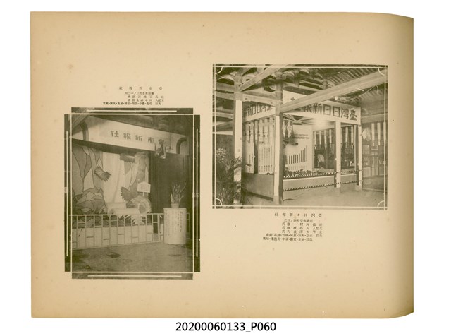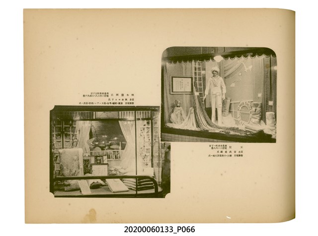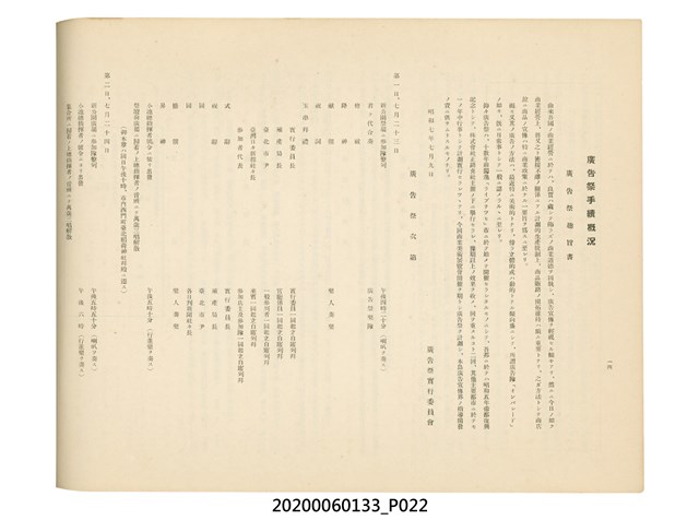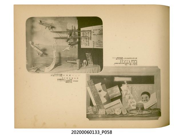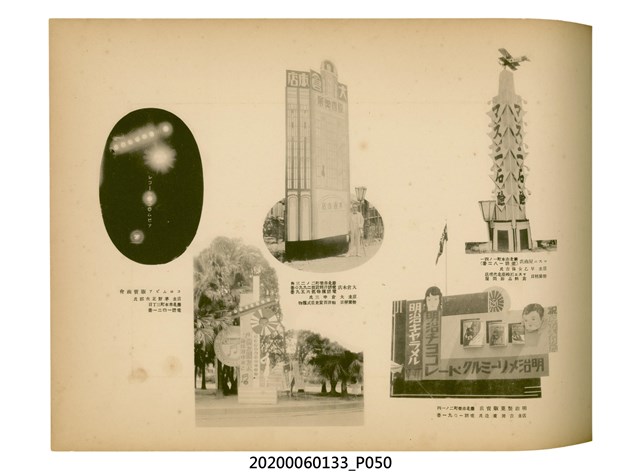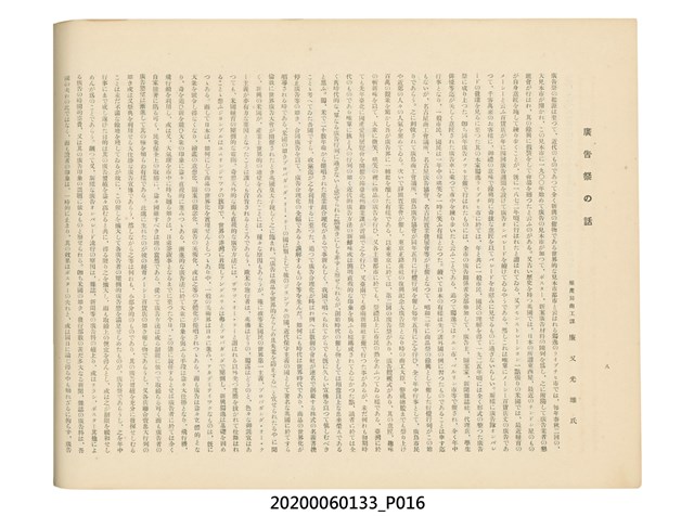 1.本物件為產業評論社發行之《臺灣總督府殖產局主催商業美術展覽會紀念帖》。封面、封底以深紅色為底色,精裝線裝。封面上半部由右而左橫印「臺灣總督府殖產局主催」、「商業美術展覽會紀念帖」兩排字,「主催」是日文主辦之意。內頁首頁續印兩排書名,並在書名下橫印「海老原耕水編」字樣。內文前有緒言、目次。內容分為兩大部分,前半部為文字,收錄殖產局長、臺北市尹以降,各官民之祝辭,以參與者感言、參展程序、廣告政策概要等,共數十篇文章。後半部為總督、總務長官及展覽會寫真照片。文末附有版權頁,上載著作、印刷、發行等相關資訊。 2.為指導及獎勵臺灣全島事業經營者使用商業廣告,促進臺灣產業開發及工商業進展,1932年7月20至24日間,臺灣總督府殖產局結合商業團體,舉辦商業美術展覽會,由殖產局長殖田俊吉任會長,會場設在總督府舊廳舍,即今植物園內的欽差行臺。展覽會的展示內容,包括一般商業廣告、櫥窗與櫥窗照片、戶外看板與立體電力廣告、廣告相關參考資料與統計資料等。展覽會舉行期間,並舉辦廣告祭及窗飾裝飾競技會等活動。
