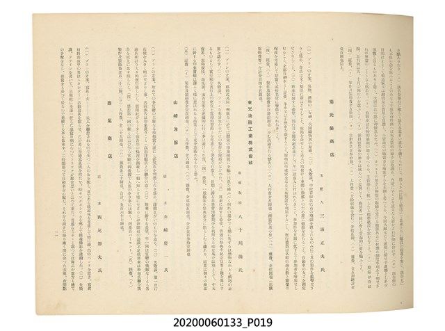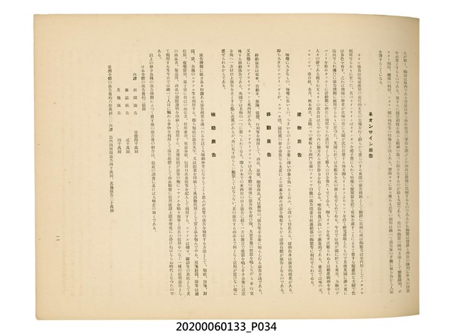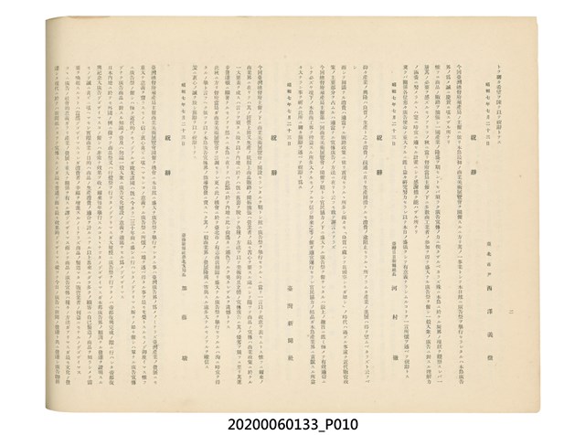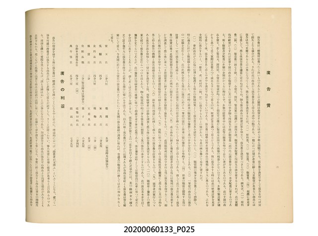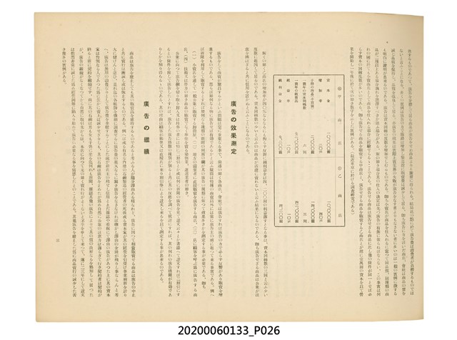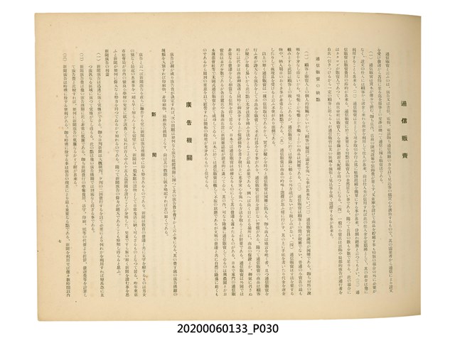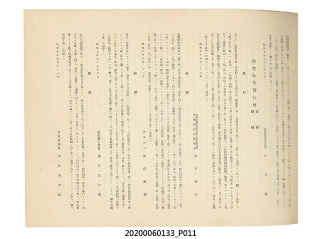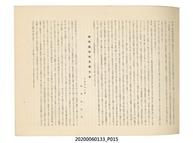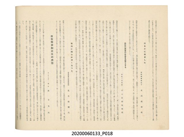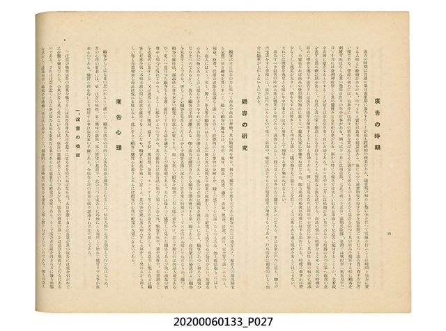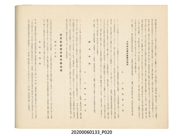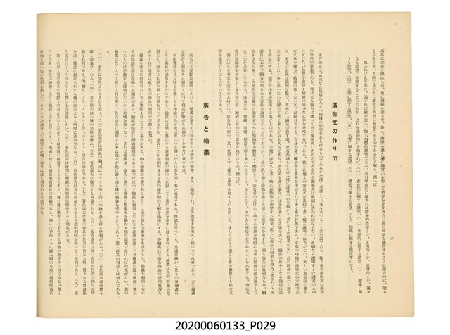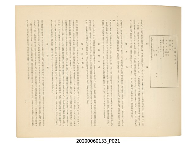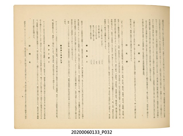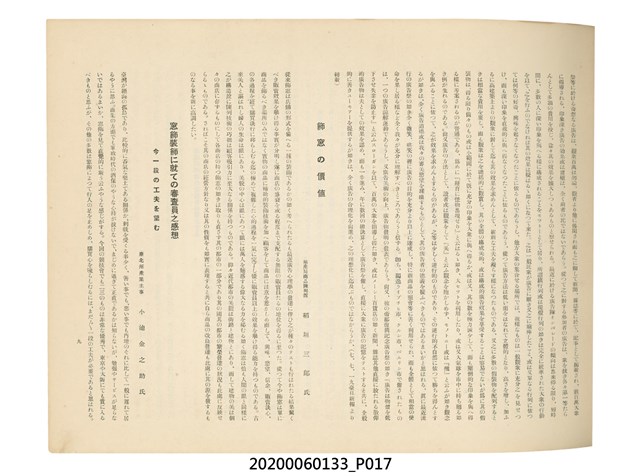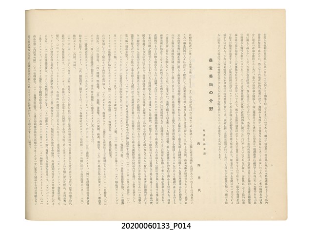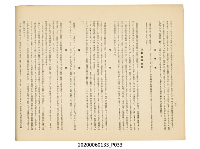1.本物件為產業評論社發行之《臺灣總督府殖產局主催商業美術展覽會紀念帖》。封面、封底以深紅色為底色,精裝線裝。封面上半部由右而左橫印「臺灣總督府殖產局主催」、「商業美術展覽會紀念帖」兩排字,「主催」是日文主辦之意。內頁首頁續印兩排書名,並在書名下橫印「海老原耕水編」字樣。內文前有緒言、目次。內容分為兩大部分,前半部為文字,收錄殖產局長、臺北市尹以降,各官民之祝辭,以參與者感言、參展程序、廣告政策概要等,共數十篇文章。後半部為總督、總務長官及展覽會寫真照片。文末附有版權頁,上載著作、印刷、發行等相關資訊。 2.為指導及獎勵臺灣全島事業經營者使用商業廣告,促進臺灣產業開發及工商業進展,1932年7月20至24日間,臺灣總督府殖產局結合商業團體,舉辦商業美術展覽會,由殖產局長殖田俊吉任會長,會場設在總督府舊廳舍,即今植物園內的欽差行臺。展覽會的展示內容,包括一般商業廣告、櫥窗與櫥窗照片、戶外看板與立體電力廣告、廣告相關參考資料與統計資料等。展覽會舉行期間,並舉辦廣告祭及窗飾裝飾競技會等活動。